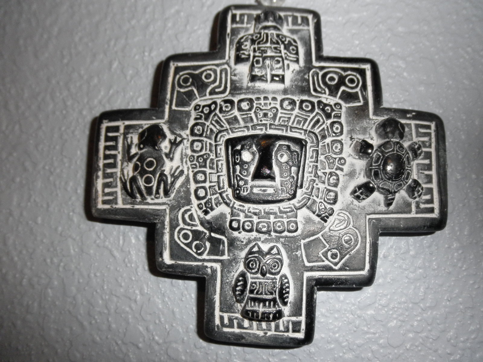 The chakana looked like an Aymara representation of their cosmic viewpoint: the image of Viracocha, with twenty-four solar rays (19 around his head and 5 on his beard) emanating from his anthropomorphic spirit, was at the center. Four totem animals were placed at the four cardinal directions: a condor in the north, an owl in the south, a frog in the west, and a turtle in the east.