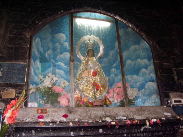 I walked toward the front of the cathedral, where I spotted the ornate statue of the Virgin of Copacabana. She was dressed in a cone-shaped pink dress, resembling the Andean sacred mountain; in her right hand she held a candle, with a silver-gold basket hanging from her wrist; in her left hand she held El Nino, the Divine Child; behind her head was a golden solar aureole with stars, symbolizing the Virgin as the Queen of Heaven; at her feet was the crescent moon, which symbolized the female goddess of fertility.
