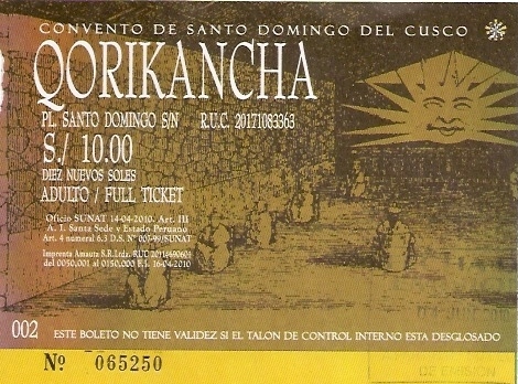 The first part of the Coricancha that we saw as we turned left (east) from Avenida El Sol was the finely carved semicircular 6 m (20ft) tall western wall of what at one time was a temple called Intiwasi (“House of the Sun”). In front of the terraces on which the temple stood was a small park and garden area. The ticket that we bought at the entrance said that the former sacred place we were entering was now known as the Convento de Santo Domingo del Cusco. Holy Sunday (Santo Domingo) had now replaced The Temple of the Sun. That was ironic, to say the least.