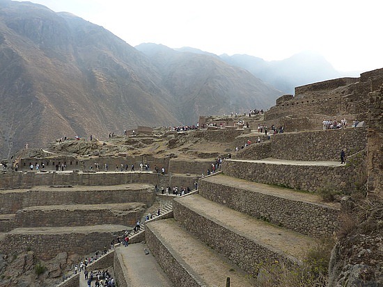 When we arrived at Ollantaytambo, we found out what an Inka fortress looked like. Originally named Qosqo Ayllu (“Cusco community”), the town and its surroundings are now included in the vast complex known locally as the Archaeological Park of Ollantaytambo, which covers the entire Vilcanota valley on both sides of the river at Kilometer 68 of the Cusco-Santa Ana railroad. The cobblestone streets of the town and its courtyards face a steep hill with sixteen massive carved stone terraces – with a stairway between the terraces – that were built to protect the valley from invaders. It was a line of defense for the city of Cusco. At the top of the terraces was the fortress (called Araqama Ayllu) where the puppet emperor Inca Manco Capac II Yupanqui tried to retake the Inca Empire and fought off the Spanish conquistadors before retreating to the jungles of Vilcabamba.